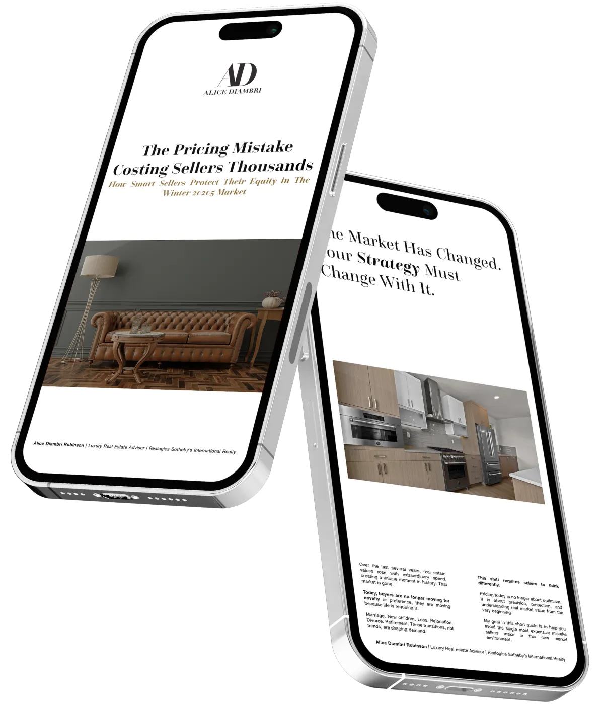 Two smartphones displaying pages from “The Pricing Mistake Costing Sellers Thousands,” a real estate information guide by Alice Diambri Robinson.